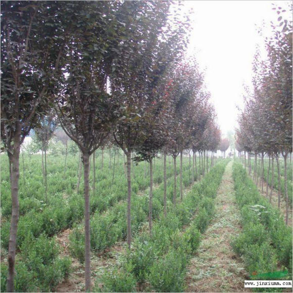 紅葉李形態(tài)特征:灌木或小喬木,高可達(dá)8米;多分枝,枝條細(xì)長(zhǎng),開(kāi)展,暗灰色,有時(shí)有棘刺;小枝暗紅色,無(wú)毛;冬芽卵圓形,先端急尖,有數(shù)枚覆瓦狀排列鱗片,紫紅色,有時(shí)鱗 片邊緣有稀疏緣毛。葉片橢圓形、卵形或倒卵形,極稀橢圓狀披針形,長(zhǎng)3-6厘米,寬2-3厘米,先端急尖,基部楔形或近圓形,邊緣有圓鈍鋸 齒,有時(shí)混有重鋸齒,上面深綠色,無(wú)毛,中脈微下陷,下面顏色較淡,除沿中脈有柔毛或脈腋有髯毛外,其余部分無(wú)毛,中脈和側(cè)脈均突起,側(cè)脈5-8對(duì);葉柄 長(zhǎng)6-12毫米,通常無(wú)毛或幼時(shí)微被短柔毛,無(wú)腺;托葉膜質(zhì),披針形,先端漸尖,邊有帶腺細(xì)鋸齒,早落。